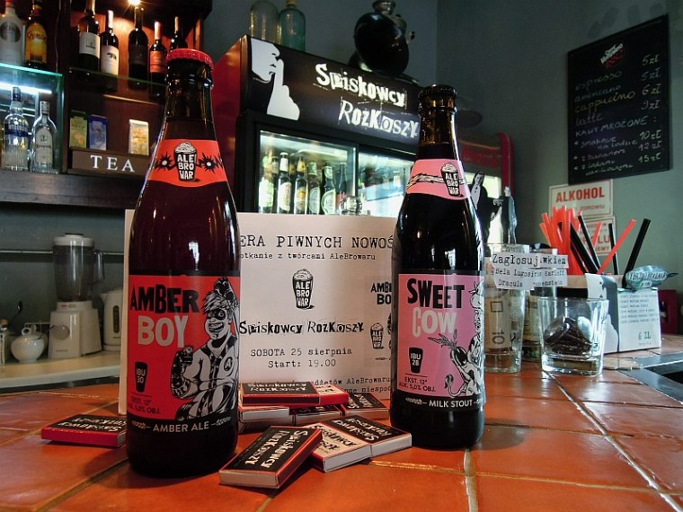 25 sierpnia punktualnie o godz. 19 z kranów kilkunastu lokali z dobrych piwem popłynęły nowości AleBrowaru: Sweet Cow oraz Amber Boy. Główne wydarzenie z udziałem całej ekipy AleBrowaru miało miejsce w Warszawie. Pierwotnie planowane w 17:15, wskutek perturbacji lokalowych omal nie zostało odwołane. Na szczęście w ostatniej chwili udało się zorganizować rollbar, który zainstalowano w lokalu „Spiskowcy Rozkoszy”. Trzeba przyznać, że warszawscy miłośnicy dobrego piwa stawili się tłumnie, takiej kolejki po piwo to miasto nie oglądało już dawno! Chłopaki z AleBrowaru przygotowali mnóstwo gadżetów związanych z nowymi piwami. Lajtmotivem była krówka, oczywiście ta z milk stouta „Sweet Cow”. Obecna była pod postacią pluszowych czapek, helowych balonów czy też krowich rogów i uszu. Nie zabrakło oczywiście koszulek, otwieraczy czy przypinek z motywem z etykiet. Trzeba przyznać, że pod tym względem AleBrowar nie ma konkurencji! A jak wypadło to co najważniejsze czyli samo piwo? Amber Boy początkowo zadziwia trochę lemoniadowym zapachem ale po pierwszym łyku jest rozkosz – głęboka, intensywna, cytrusowa goryczka rodem z trzech odmian amerykańskiego chmielu. Trzeba przyznać, że Rowing Jack ma godnego towarzysza! Natomiast co do Słodkiej Krowy to zbyt wysoka temperatura serwowania uniemożliwia na razie poznanie pełnego charakteru tego piwa. Na szybko można stwierdzić, że nie jest tak słodka jak niektórzy przypuszczali, choć specyficzny smak laktozy jest jak najbardziej wyczuwalny.