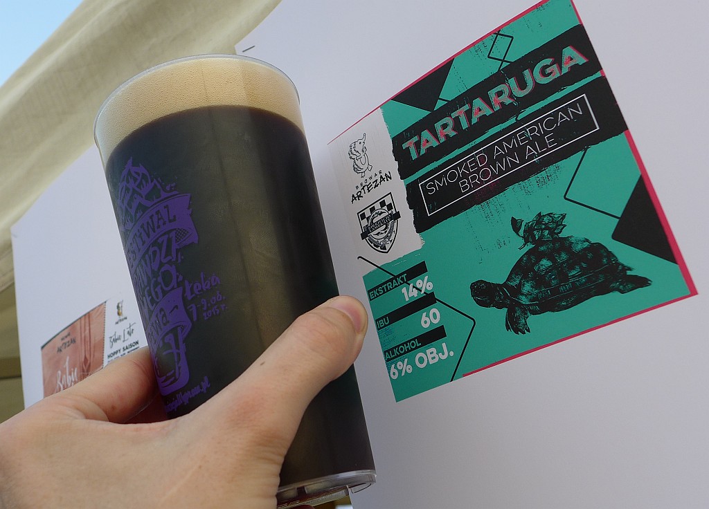artaruga Artezana i włoskiego Birreficio Lambrate (14° Smoked American Brown Ale) już od początku urzekało drobną, gęstą pianą. Zaskakiwał bogaty i złożony aromat w którym pojawiały się nuty suszonej śliwki, delikatnej pomarańczy i chmielowej ziołowości. W smaku porządna podbudowa ciemnych słodów nadających czekoladowy akcent oraz elegancka torfowa wędzonka, szczególnie wyraźna pod koniec degustacji. Finezyjne piwo, nie ma co.