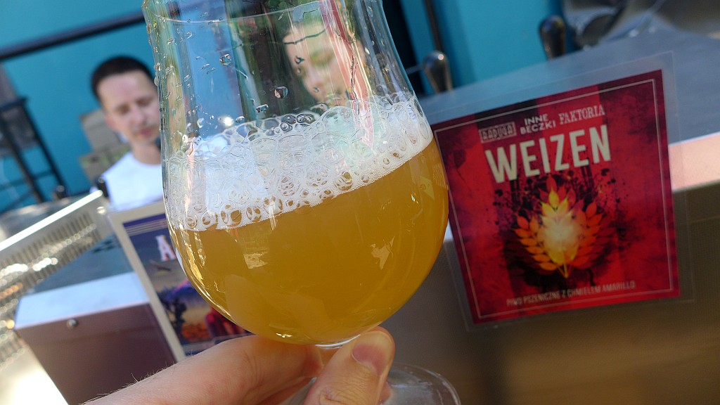 L1950387Pogoda jest ciągle bez zmian więc nie ma opcji na próbowanie piw innych niż jasnych w okolicach 5% alko. Podchodzę do Big Chill czyli inicjatywy, gdzie piwowarem jest Piotr Gwiazda z restauracyjnego Tumskiego z Płocka. Zaczynam od American Wheata o adekwatnych do pogody parametrach: 10,5° oraz 3,5%. Przyjemny aromat nowofalowego chmielu i solidna goryczka. Piwo dla tych, którzy lubią porządne chmielenie. Spróbowałem też Wit-Saisona. Charakter temu piwu zarówno w aromacie jak i smaku nadaje skórka gorzkiej pomarańczy. Trochę zaskakujący jest kompletny brak fenoli ale pod tym względem nie będę narzekał. Wytrawne, przyjemne piwo.